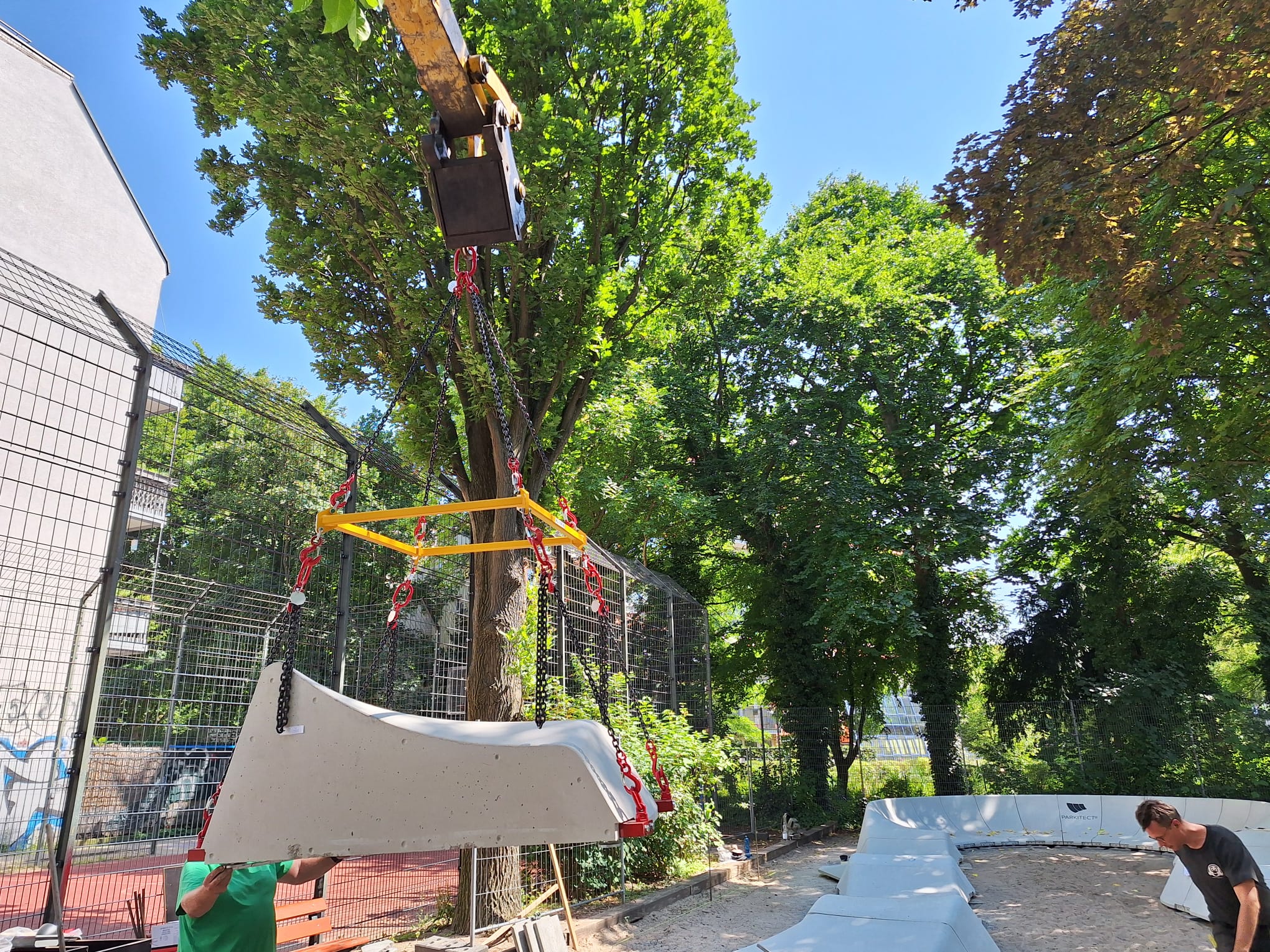 Dieser Moment, wenn das letzte Modul wie angegossen in die vorgesehene Lücke passt – unvergleichlich für das ganze Team. Und auch die erste Proberunde auf dem Skateboard darf nicht fehlen – jetzt müssen nur noch die Fugen versiegelt werden.