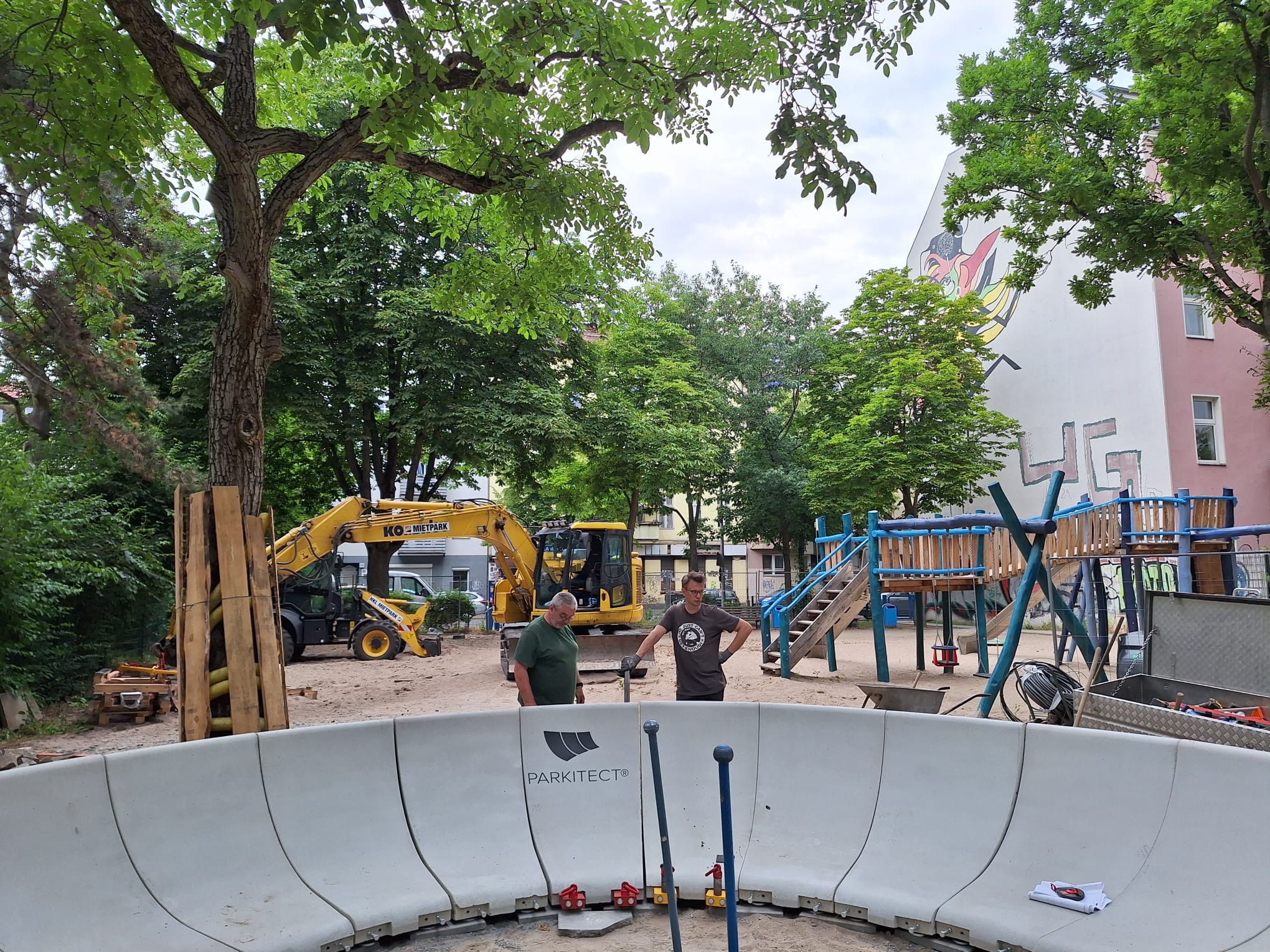 Das Wetter spielt mit, aber auch bei Regen könnte gearbeitet werden – ein entscheidender Unterschied zu Baustellen an Asphaltpumptracks.
